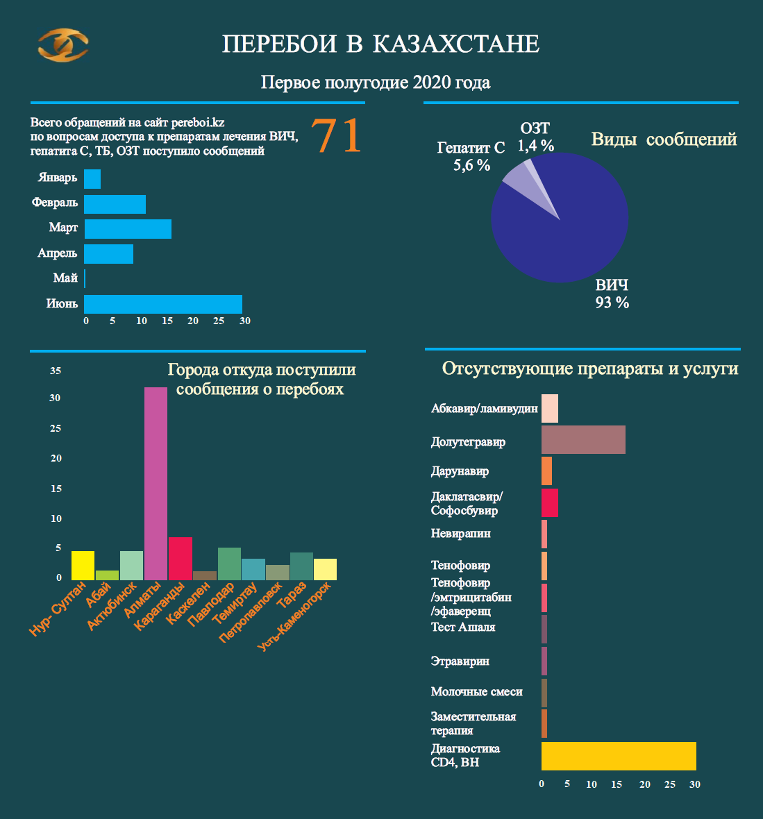 В 2020 году на сайт поступило 71 сообщение, 93% из них касались проблем с обеспечением АРВ-препаратами и средствами диагностики при лечении ВИЧ. Сообщения поступали с начала года, максимальное количество жалоб пришлось на июнь.