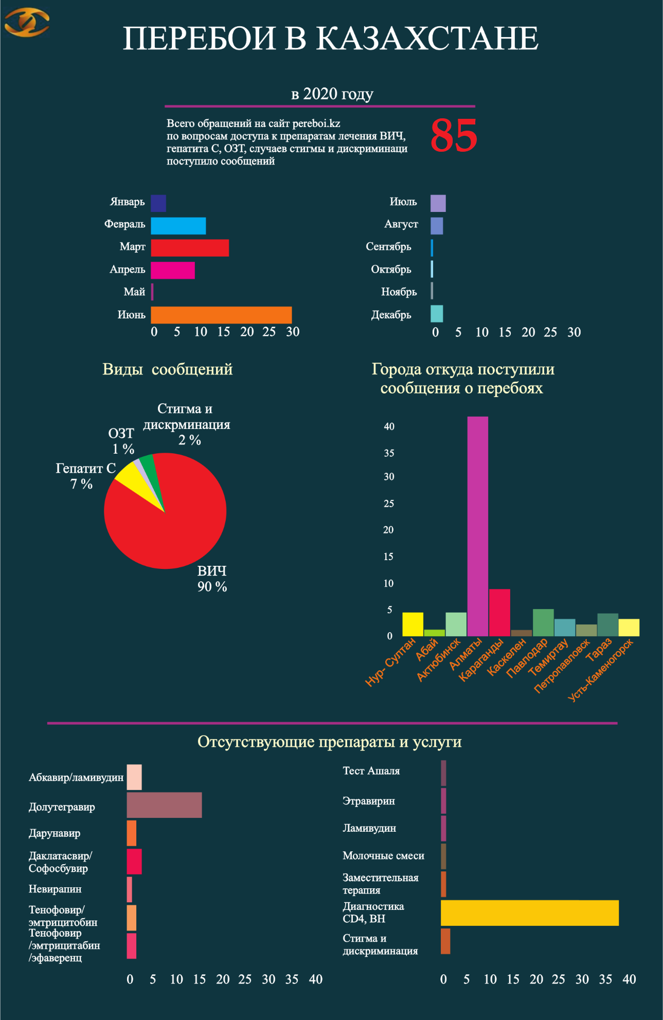 С 1 января по 31 декабря на сайт поступило 85 сообщений, 87% из них касались проблем с лечением ВИЧ. О перебоях в обеспечении АРВ-препаратами поступило 36 сообщений, 38 сообщений — об отказах в исследованиях на вирусную нагрузку (ВН) и/или иммунный статус (ИС).