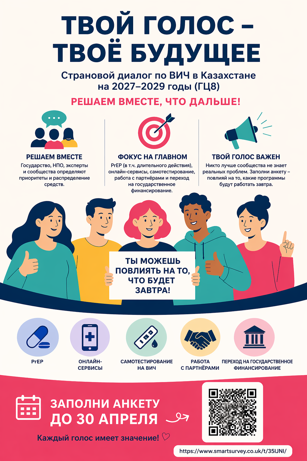 Почему важно именно ваше участие? Потому что никто лучше сообщества не знает реальных проблем: где нет доступа к услугам, что не работает, где есть стигма или барьеры. Заполнение анкеты — это не формальность, это реальный способ повлиять на распределение ресурсов. Если не сказать сейчас — потом эти решения будут приняты без вас. Поэтому участие в страновом диалоге — это про влияние, прозрачность и будущее программ, которые нужны вам и вашему сообществу.Заполни анкету до 30 апреля — это твой реальный шанс повлиять на распределение средств, и здесь важен каждый голос: https://www.smartsurvey.co.uk/t/35IJNI/